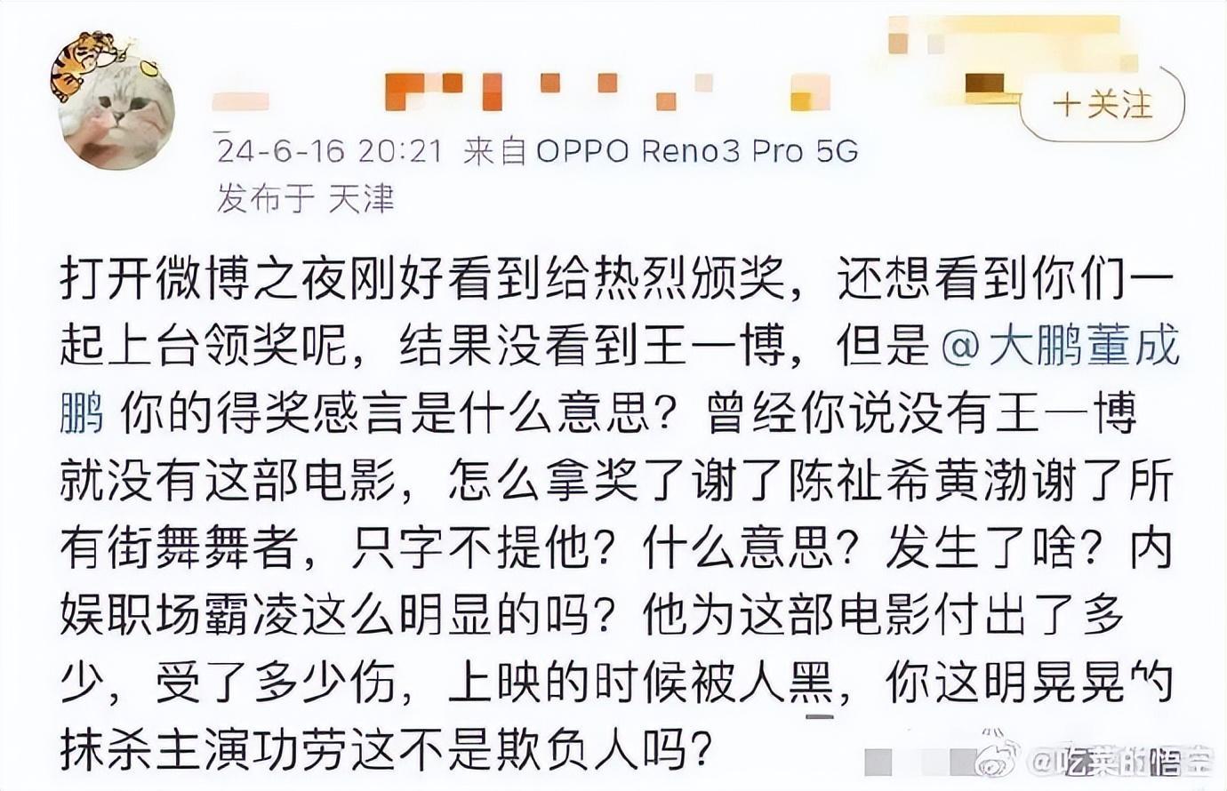 最近大鵬在某活動上,因爲電影《熱烈》獲獎,在上臺致辭時,他感謝了《熱烈》的所有工作人員,卻沒有感謝在臺下坐着的王一博。