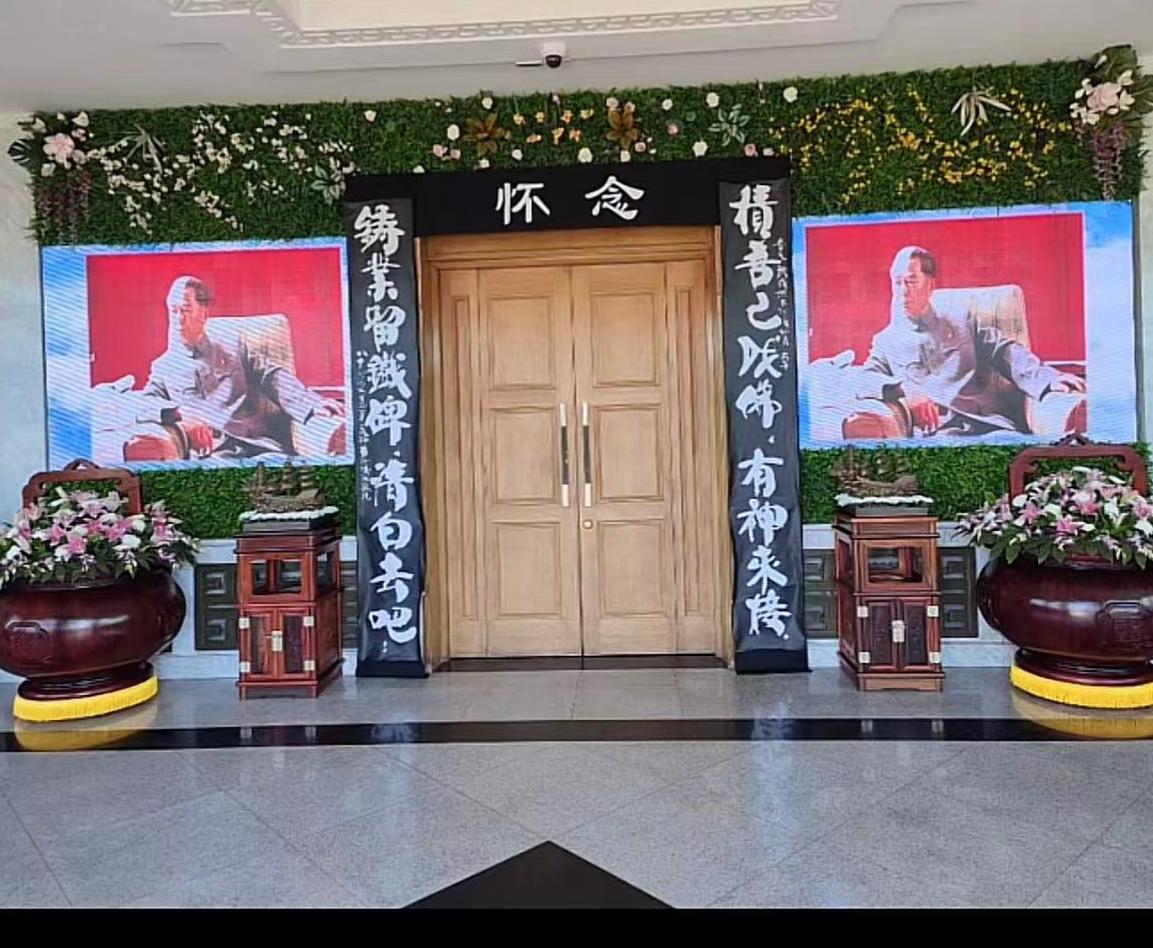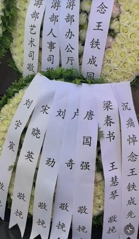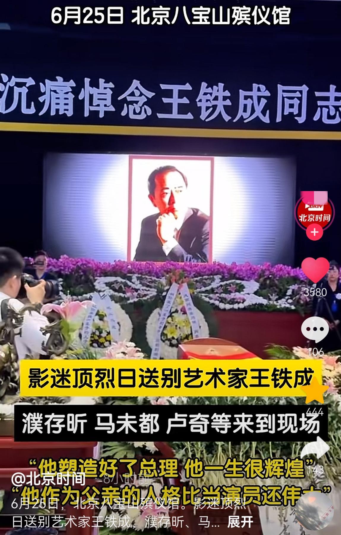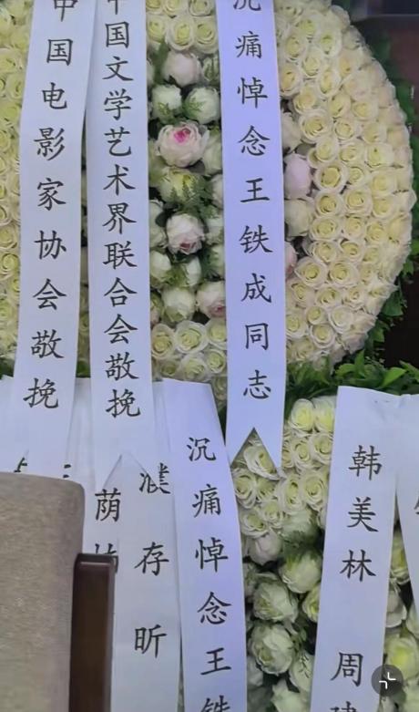 而在東禮堂牌匾下面,掛着“沉痛悼念王鐵成同志”的橫批,左右兩邊的輓聯分別寫着“演技絕倫,情出於心”“再現周公,光照後人”。