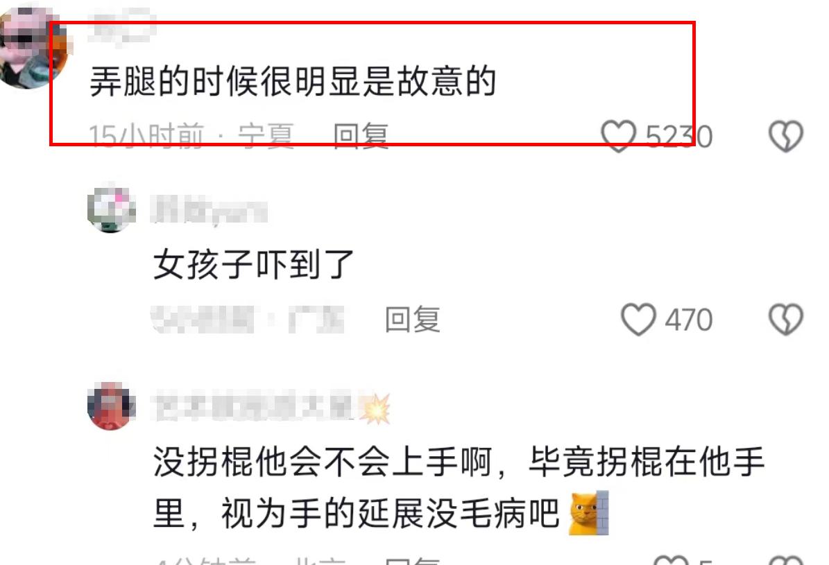 說完這句話後,他又拿起柺杖,在女孩兩腿之間反覆扒拉,動作非常不堪,隨後他還嚷嚷說要帶女孩去派出所。