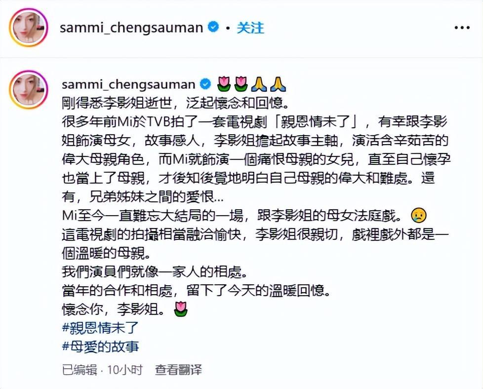 李影去世的消息被曝光後,劉松仁、鄭秀文等人紛紛發文悼念。