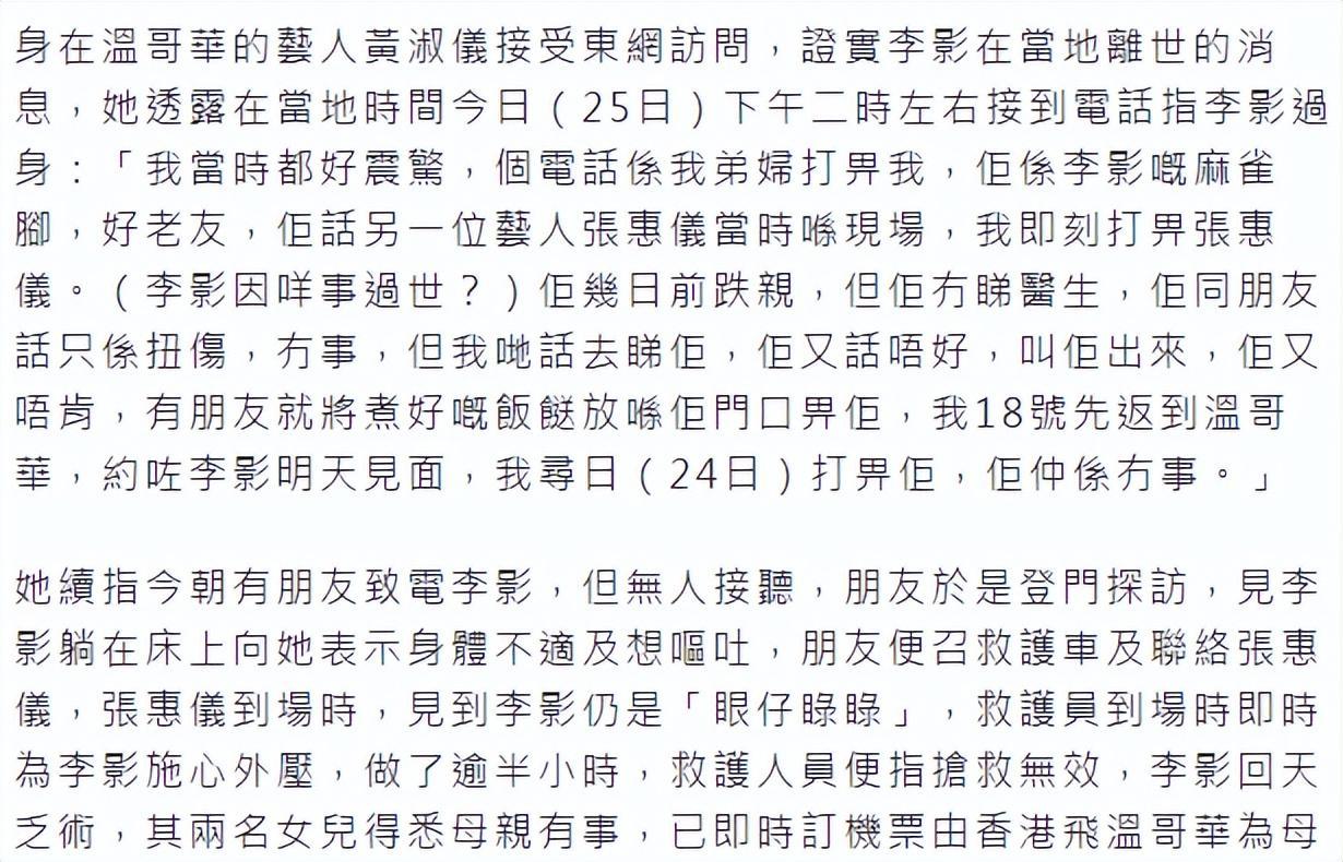 據李影的好友黃淑儀透露,李影是在家中摔傷去世。