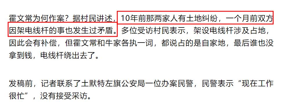 媒體採訪了當地村民,村民說10年前,霍文常就和牛某一家存在土地糾紛。