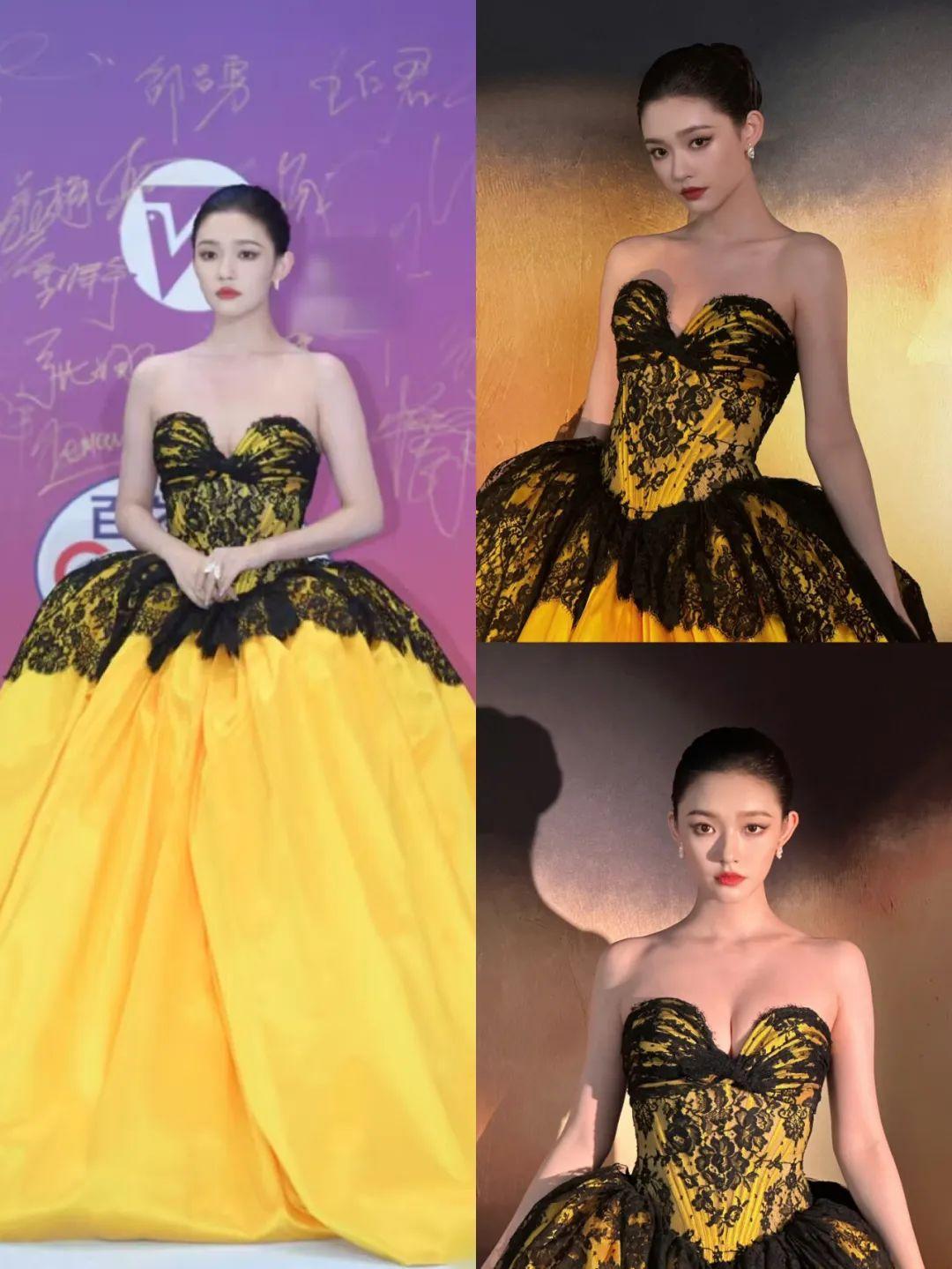 林允,這件黑色蕾絲裝飾的明黃色大蓬裙同樣佔地面積很大,勝在顏色亮眼和身材性感。