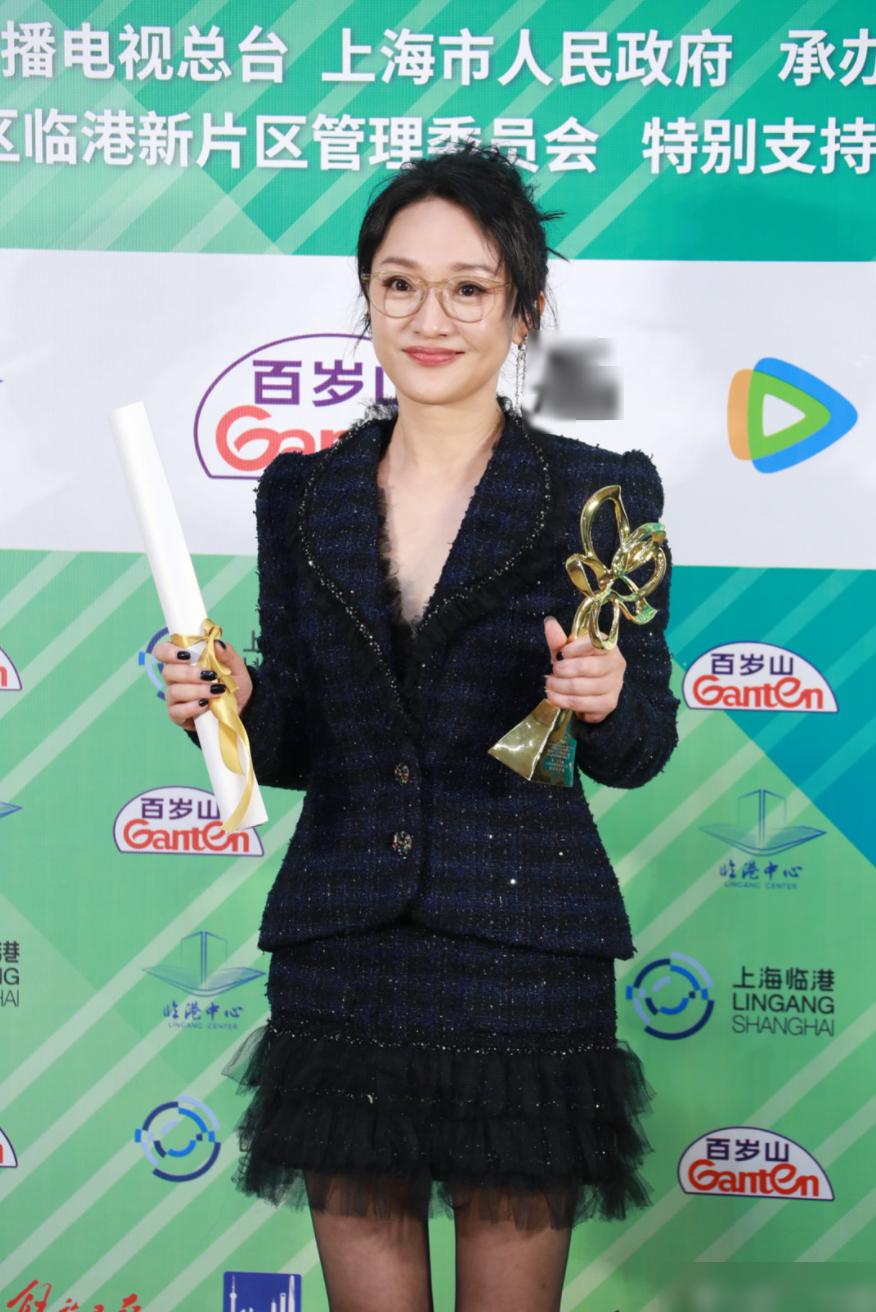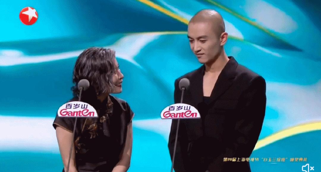 爲她頒獎的嘉賓是,去年憑藉“鍋姨”拿下同個獎項的劉丹和頂着光頭的陳曉。