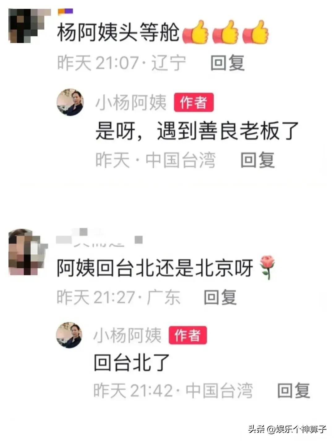 有網友發現汪小菲給保姆買了頭等艙,楊阿姨直言遇到善良的老闆,並透露正趕回臺北,照片是小玥兒幫忙的。