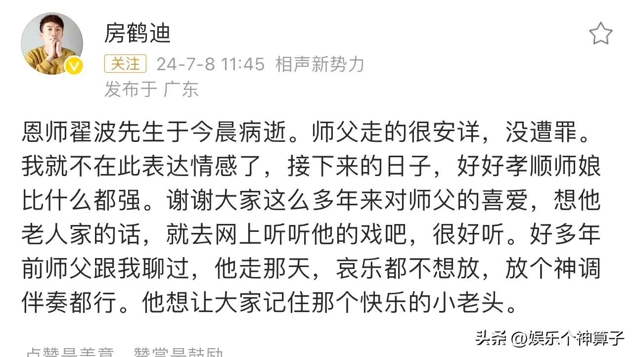 隨後,翟波的徒弟在社交平臺發文悼念,透露師傅今晨病逝,走的很安詳,沒遭什麼罪,並承諾以後會好好孝順師孃,能讓徒兒如此不捨,可見老翟頭的人品非常不錯。