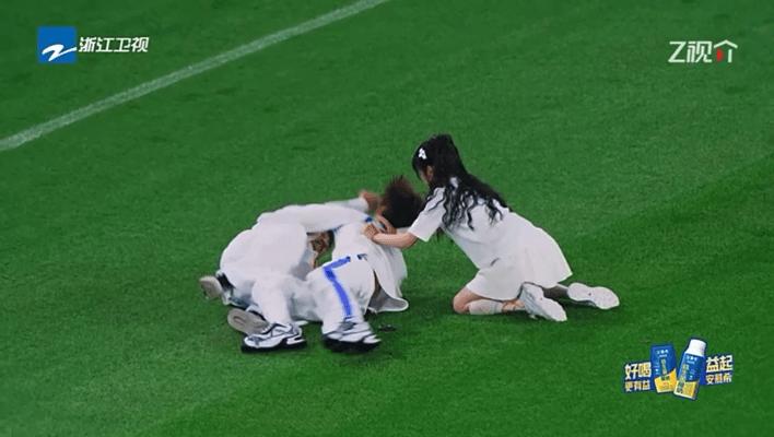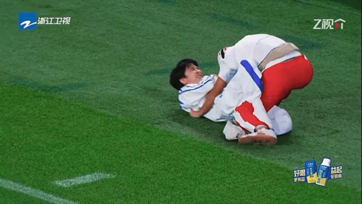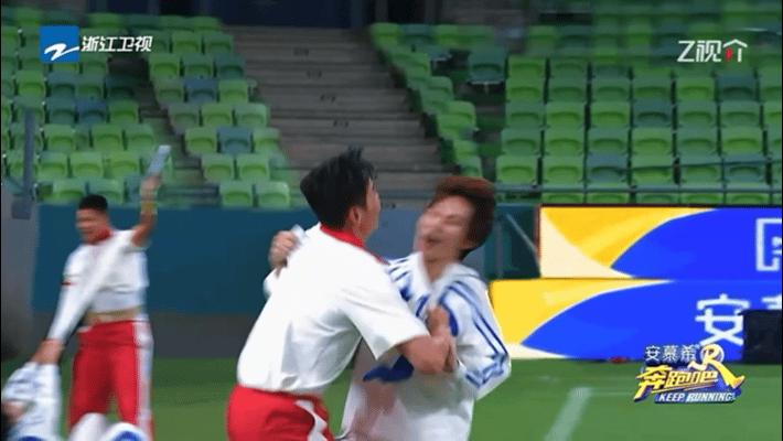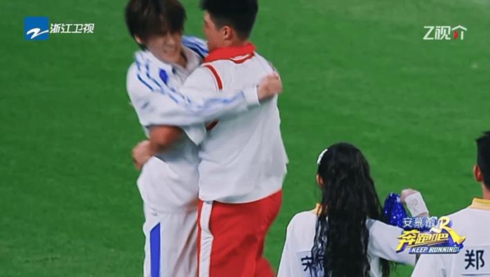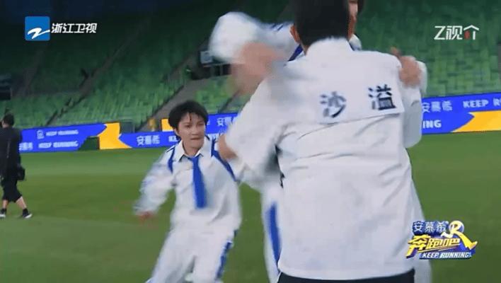 蘇炳添迅速抓住周深,強大的臂力讓周深不得動彈。鏡頭一轉,蘇炳添已牢牢地抓到周深名牌並果斷撕下。