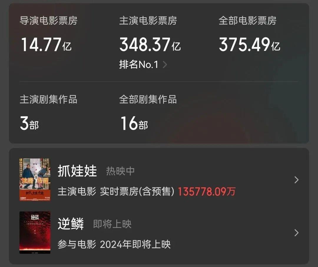 加上這部《抓娃娃》,截止目前,他主演的電影票房已突破30億。
