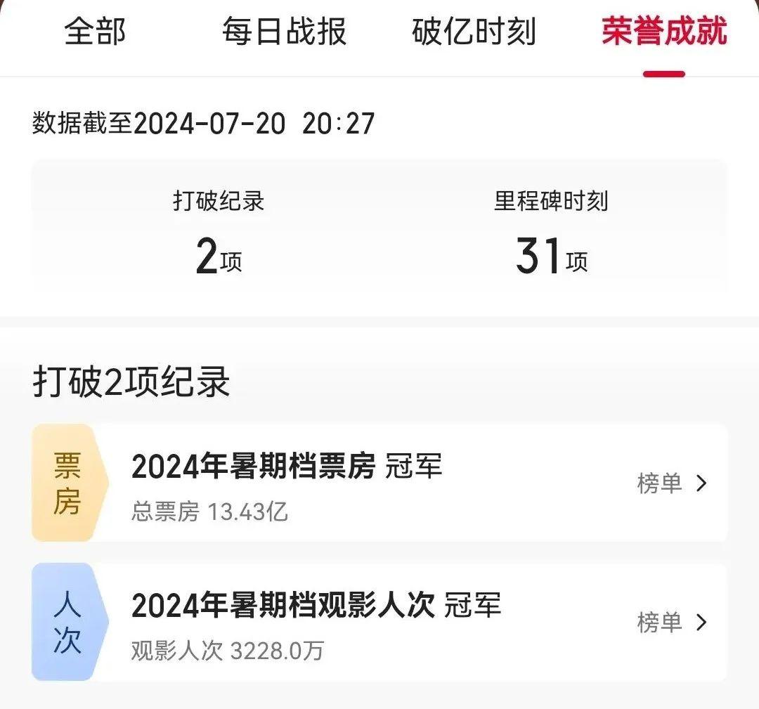此外,該片更解鎖“連續7天獲得單日票房冠軍”“2024年暑期檔觀影人次冠軍”等31項成就。