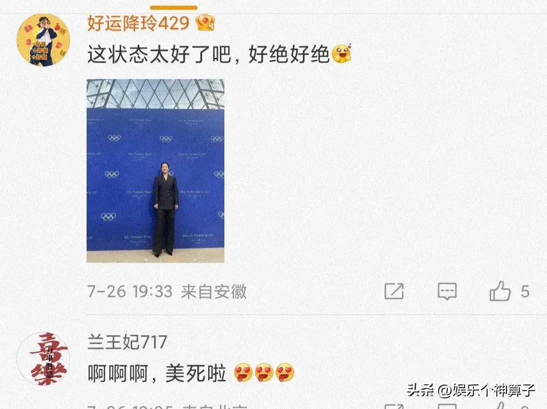 一些粉絲紛紛留言:玲姐狀態保持的真好,簡直美出了新高度,造型好颯,看到近照,終於可以安心了,還是那個大女主,大導演,那些說復胖的人,這下要失望了吧。