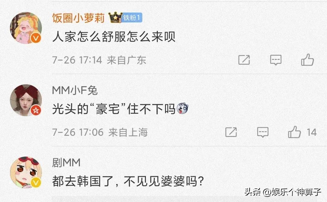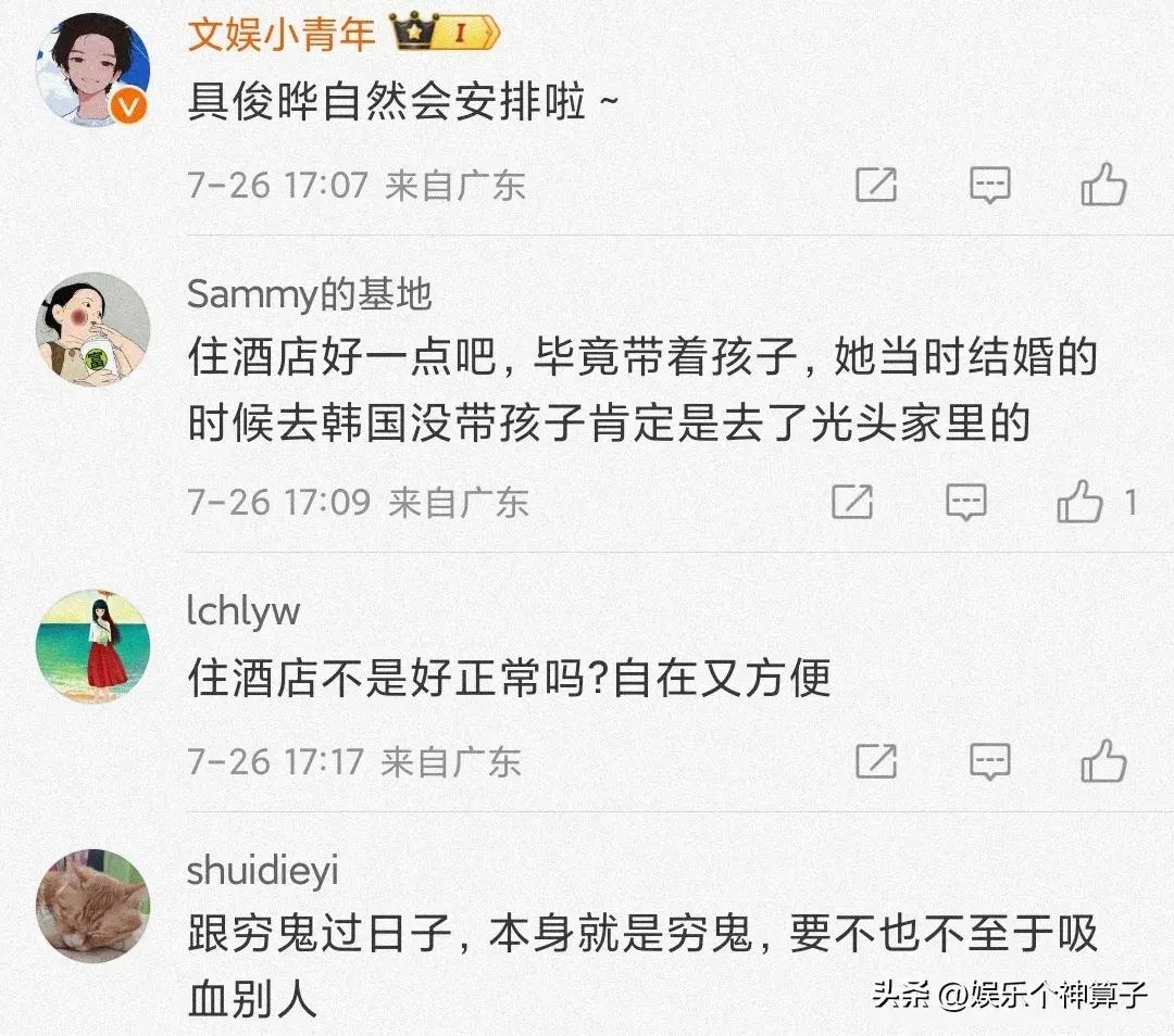 甚至一些網友紛紛表示:都到具俊曄家門口了,還住酒店?光頭不是有豪宅?到了韓國不去見婆婆,說不過去吧,正好可以趁此機會溝通一下感情,莫非不受待見。