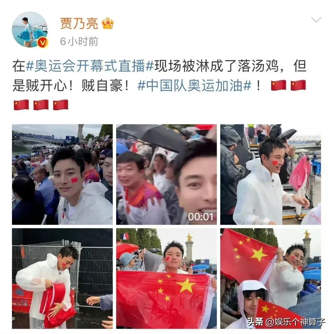賈乃亮也發文透露到達巴黎奧運會現場,觀看開幕式時,還被大雨淋透了,不過,一點沒有影響心情,反而感到驕傲和自豪。