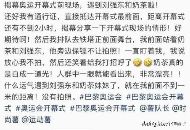 此外,這位網友還誇讚章澤天本人皮膚白皙,人羣中一眼就能認出來,並透露,劉強東爲人十分和藹可親,身旁還有保鏢跟隨,不允許路人拍攝照片。