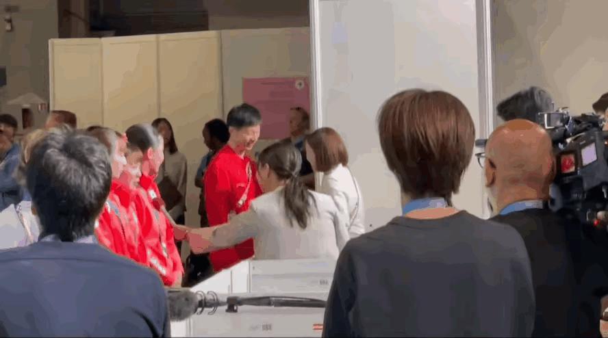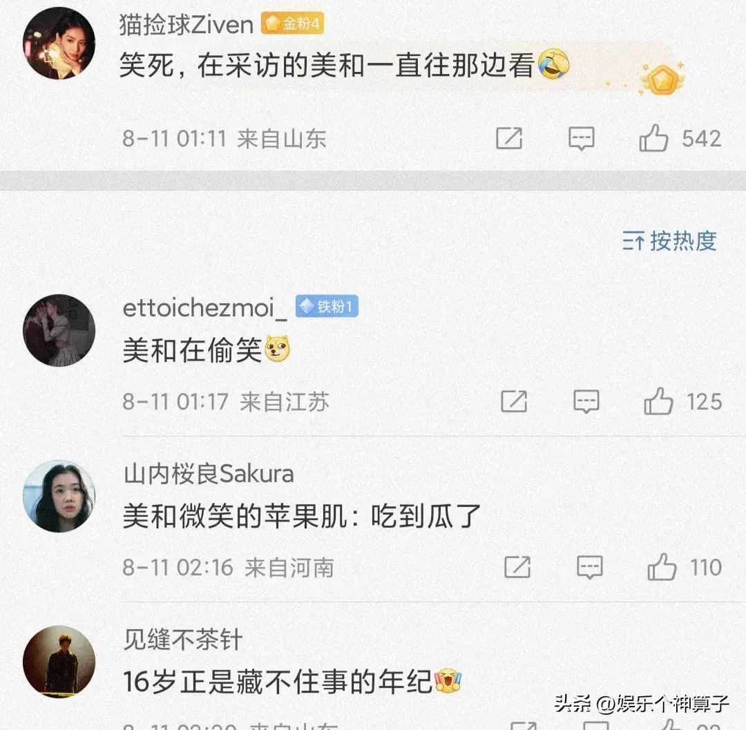 看到這一幕,一旁日本隊員美和似乎忘記正在接受採訪,目不轉睛的盯着兩人,或許是出於羨慕,滿臉笑容,嘴角上揚,也有網友調侃,美和在偷笑,好像喫到瓜了。