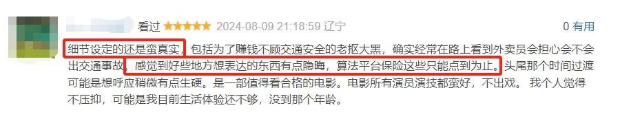 “節奏張弛有度,不會讓人緊繃又有爽點,很多生活情景都能在電影裏找到對應。真實題材永遠有力量。”