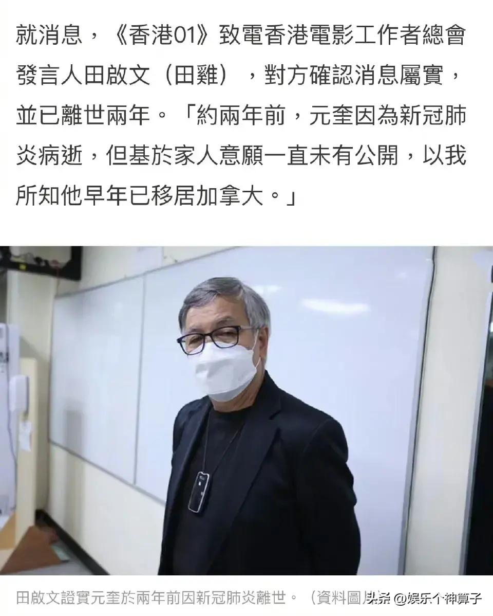 隨後,香港媒體就此事致電田啓文,對方確認消息屬實,並透露元奎早年移居加拿大,於兩年前因爲新冠病逝,基於家人的意願,消息一直沒有公開。