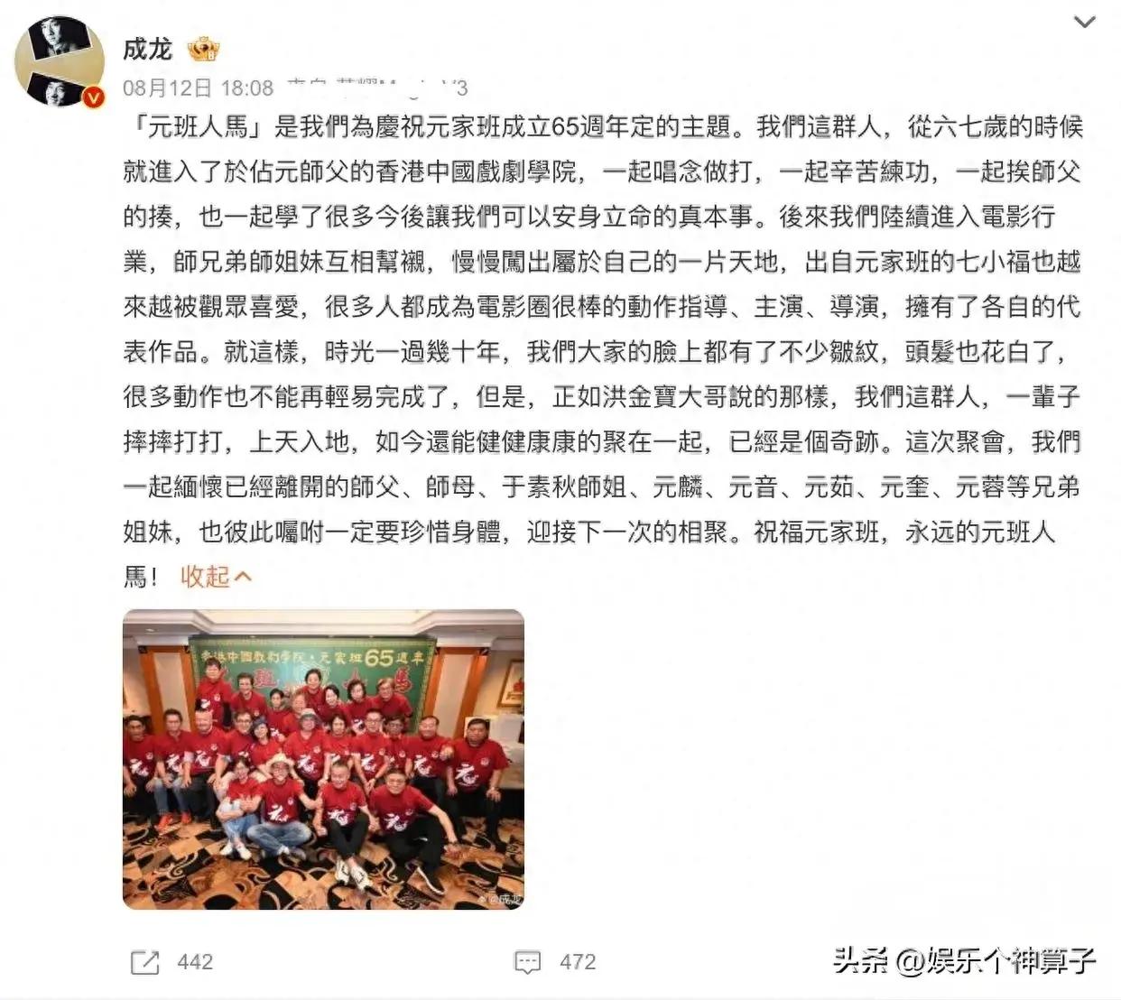 8月12日,成龍在社交平臺發文,慶祝“元家班”成立65週年,回憶起當年的往事,言語中頗多感慨,並曬出一張現場合照。