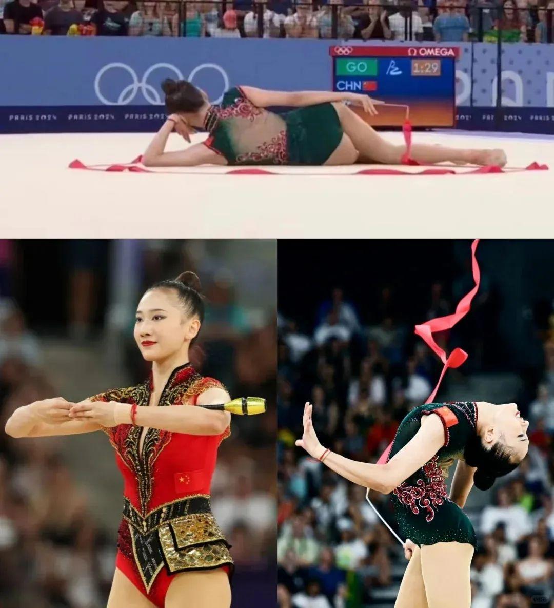 最後一輪帶操,身着一襲墨綠色旗袍的她以《醉太平》爲配樂,在古風琴韻的背景下,揮舞着紅色絲帶翩翩起舞。