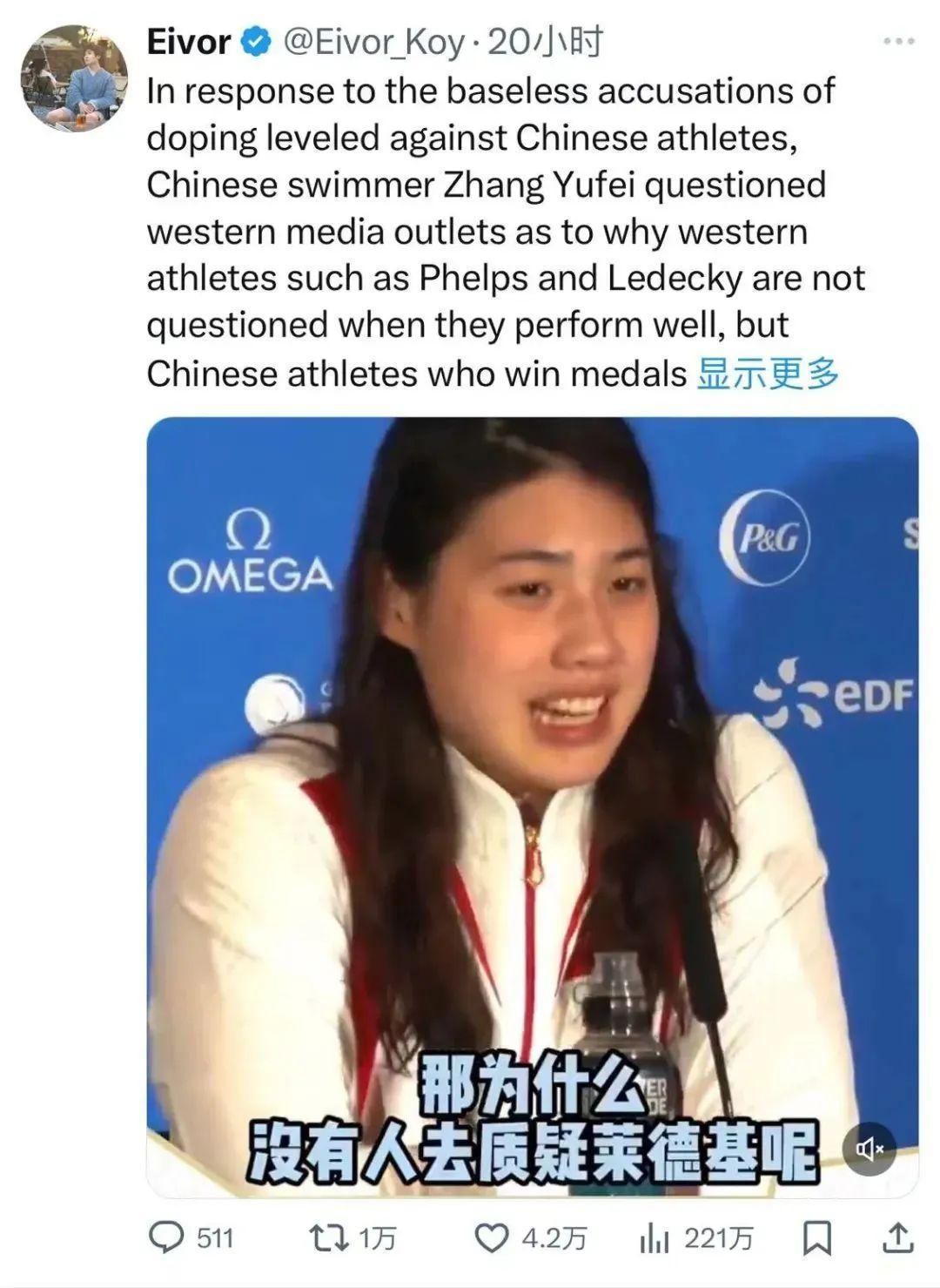回懟外媒質疑潘展樂成績的“女王發言”,是她圈粉的另一個原因。