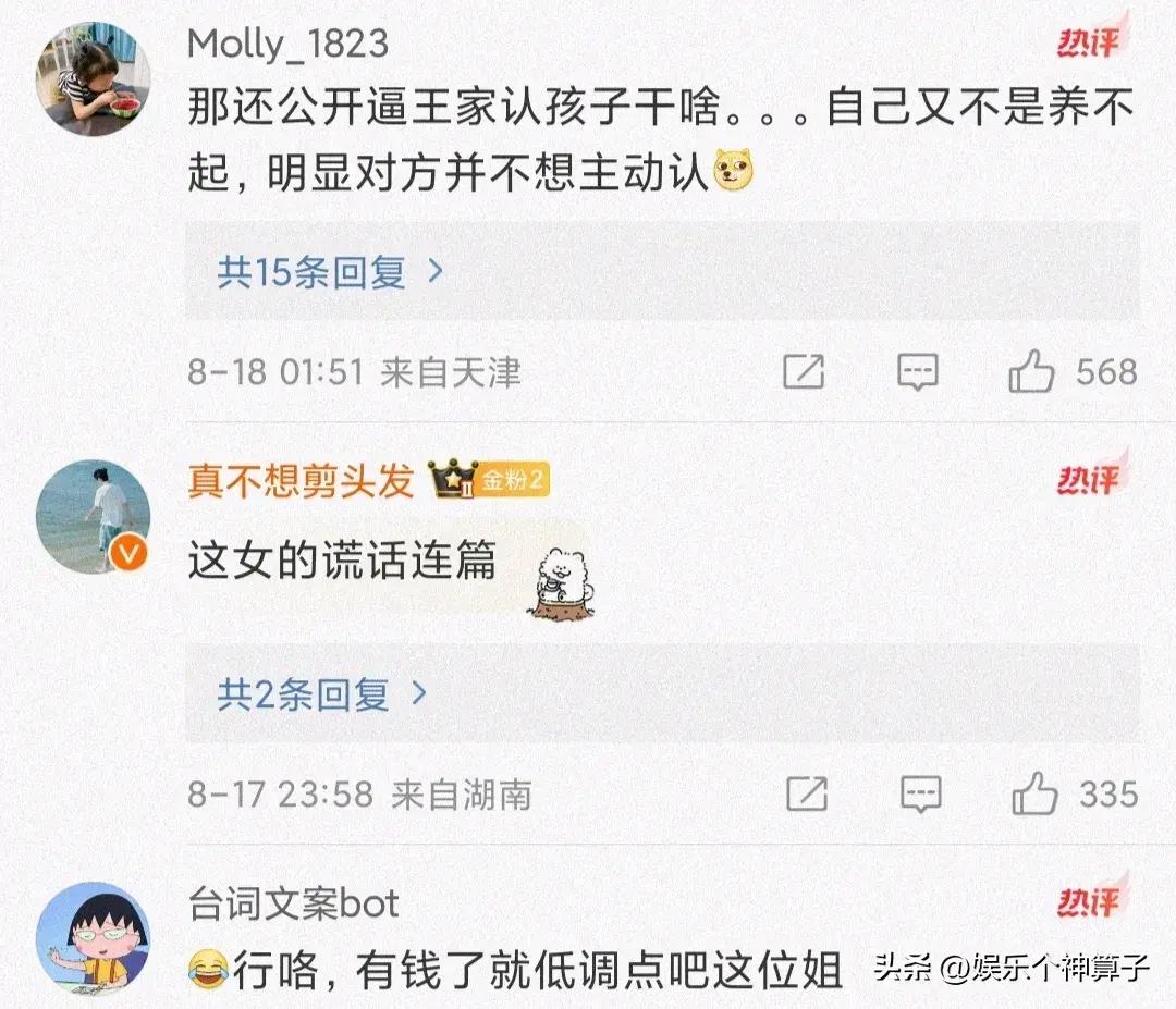 一些網友紛紛留言:嘴裏沒有一句實話,既想要王家的錢,又想立人設,真要養得起,還想方設法讓思聰認孩子,簡直就是撒謊精,應該學會低調一點。