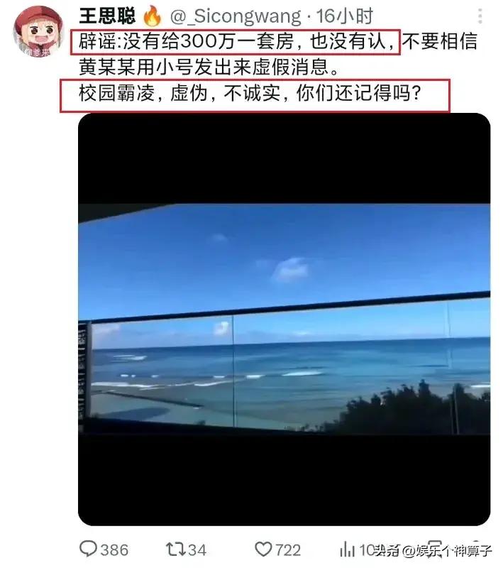 不過,網上曬出疑似思聰的小號,在社交平臺發文,否認給黃一鳴撫養費和房子,真真假假,不得而知。
