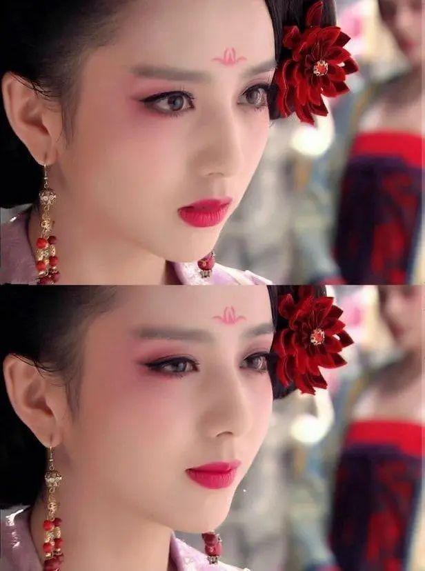 《夢迴大唐》裏佟麗婭頭戴流蘇發叉,眉眼之間一點紅,烈火紅脣,簡直美到沒朋友。