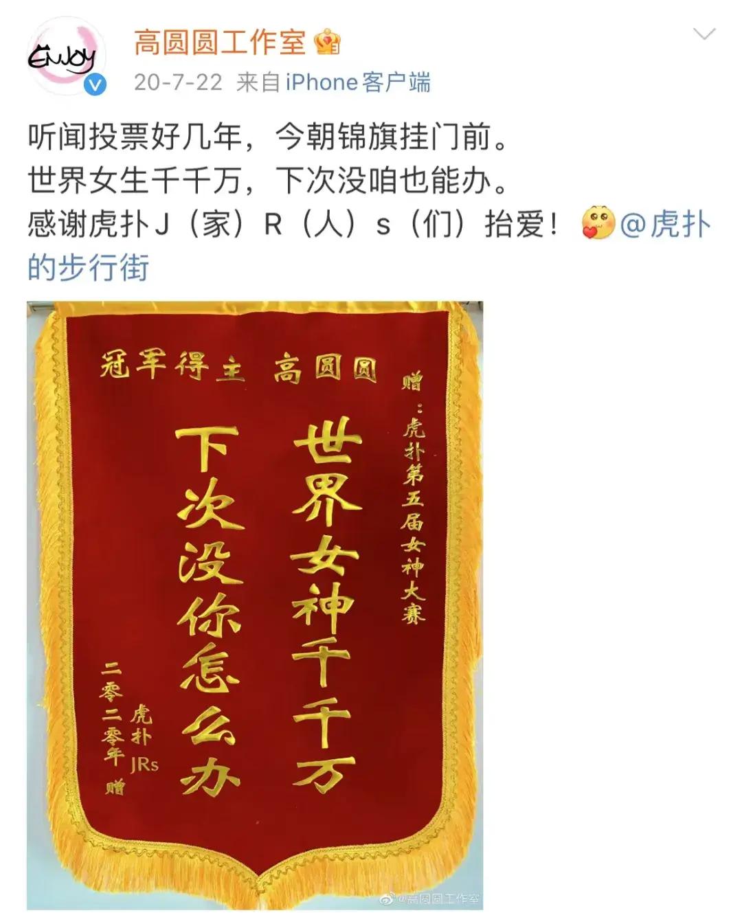 最終以近9萬票奪冠,虎撲直男敲鑼打鼓,還給圓圓工作室送了錦旗——世上女神千千萬,下次沒你怎麼辦。