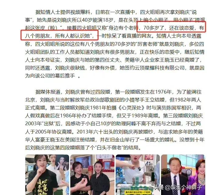 不過,八卦媒體爆料,從知情人士處獲悉,張棪琰在直播時提到的所謂“70多歲,正在熱戀,有8個男友,大家都認識”這位厲害的老師,正是劉曉慶!