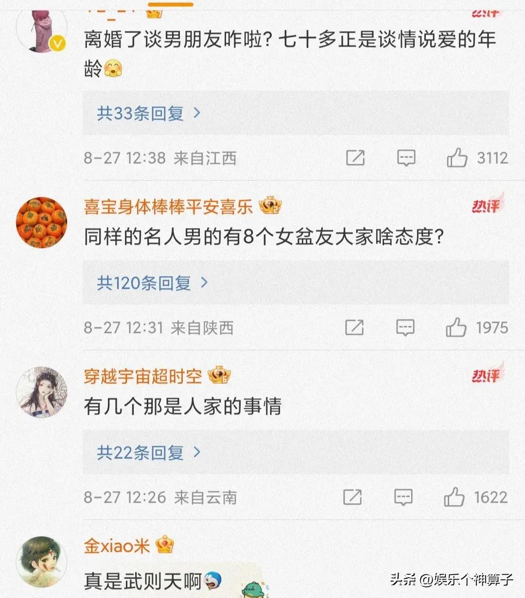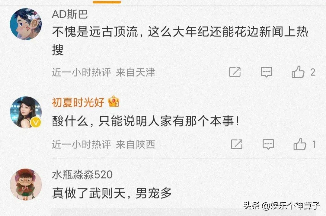 不愧演過武則天,確實厲害,這麼大年紀還能因爲花邊新聞上熱搜,不得不說,風韻猶存,還是有實力,七十多歲正是談情說愛的年齡,如果真的離婚了,就算有八個男友也正常,反而讓人非常羨慕,關鍵是這些人互相之間不介意,有點難以理解。