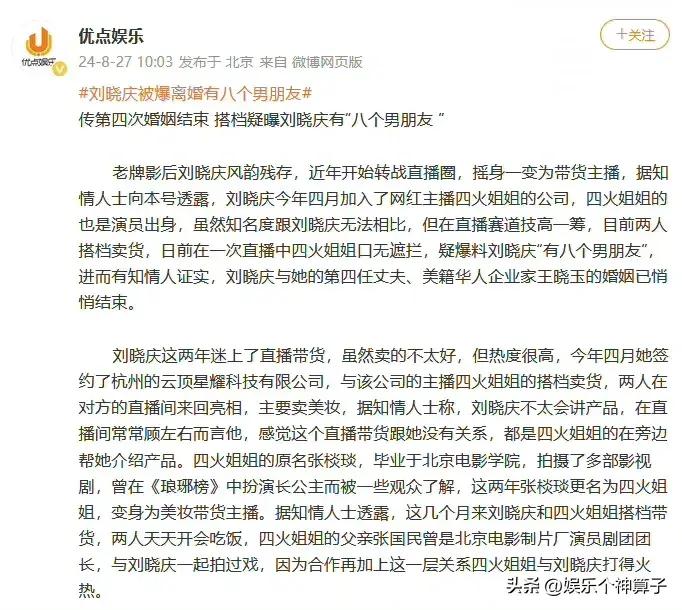 8月27日,老戲骨劉曉慶登上熱搜,然而,這一次,不是因爲以往在熒屏上塑造的衆多經典角色,而是被爆第四次婚姻結束,這……,讓人有些猝不及防,感覺好抓馬!