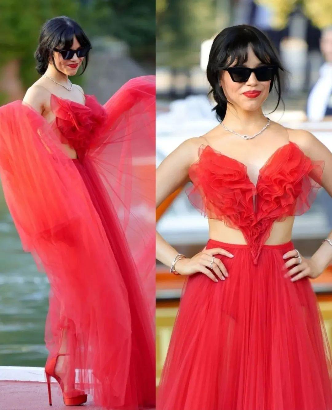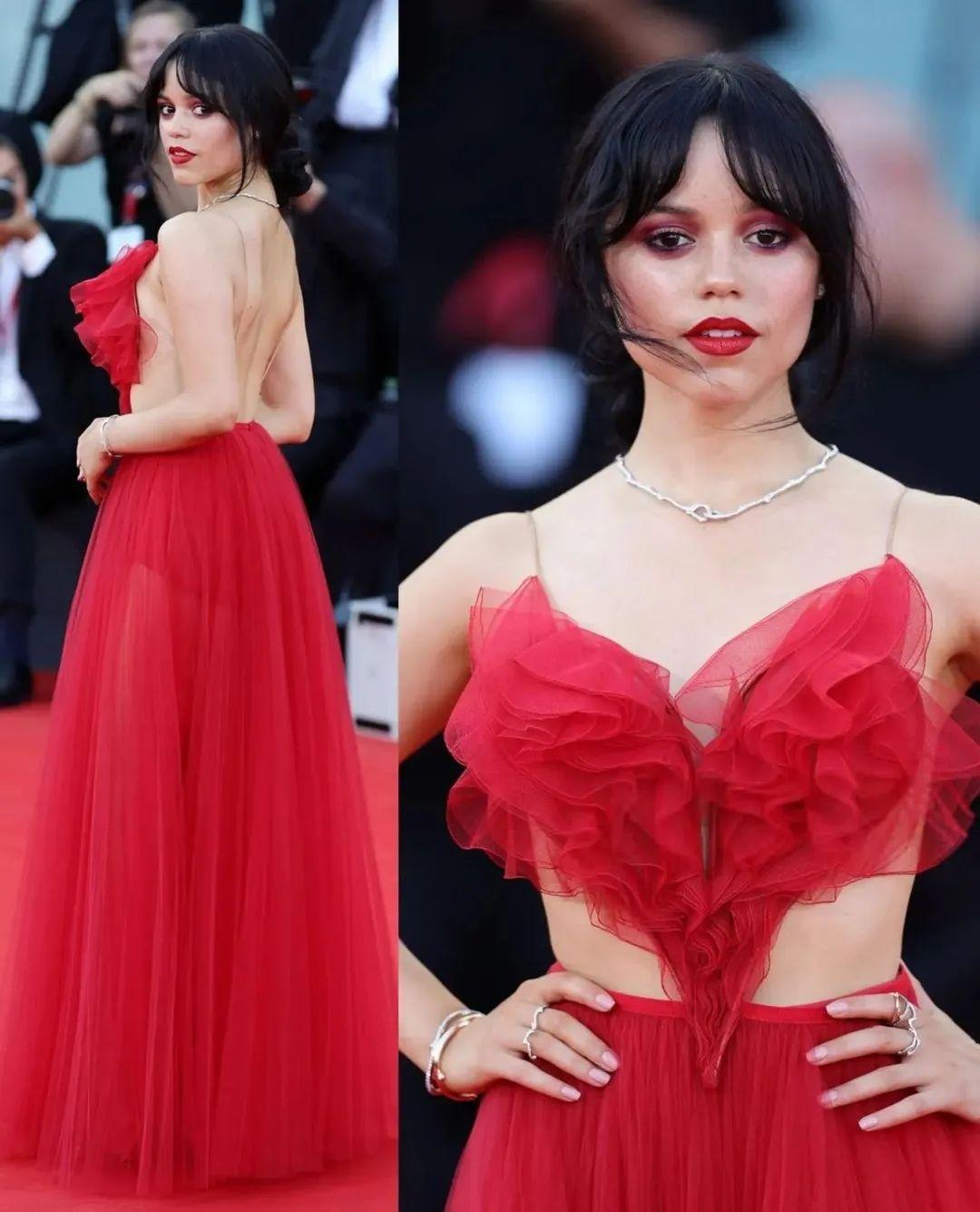 因美劇《星期三》而被國內觀衆熟知的珍娜·奧爾特加,身穿薄紗大紅裙,搭配復古大紅脣,一出場就很搶眼。