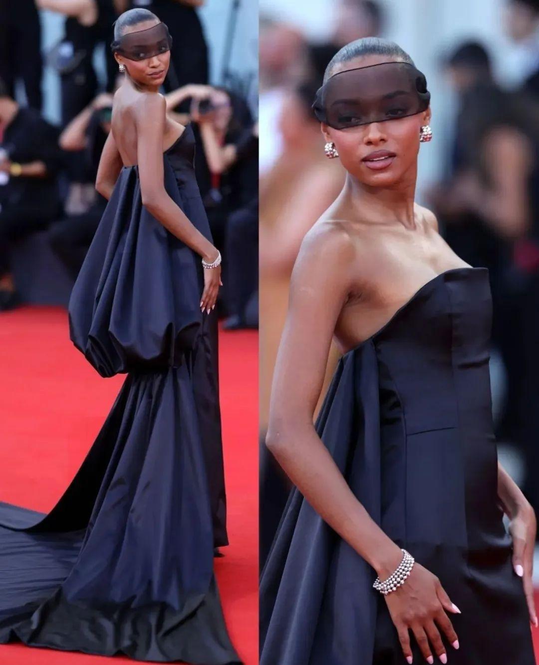 威尼斯電影節上的她穿着黑色側開叉抹胸裙,搭配白色Choker。