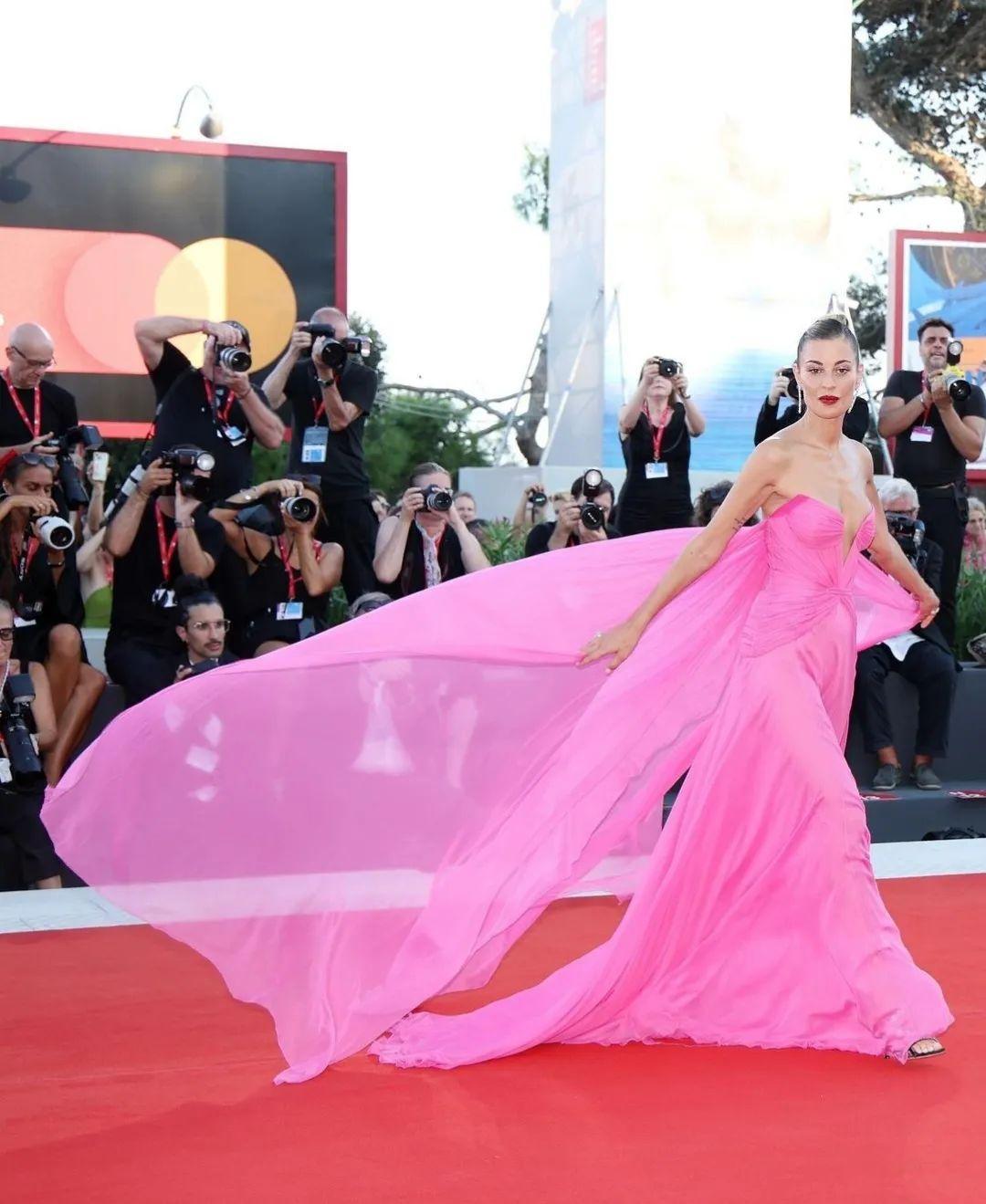 一身死亡芭比粉的斯維娃·阿維蒂,配合紅毯上恰到好處的風,完美複製了夕陽紅旅行團大媽打開絲巾,在著名經典打卡的經典pose。