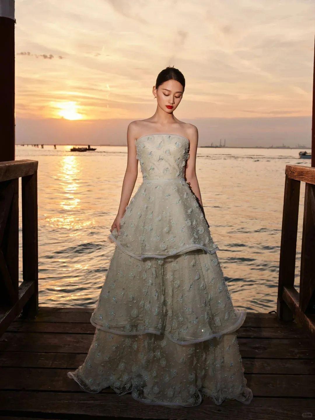 定製的Tamara ralph禮服,收腰的設計顯得腰細,而垂墜的裙襬又很飄逸,仙氣十足。