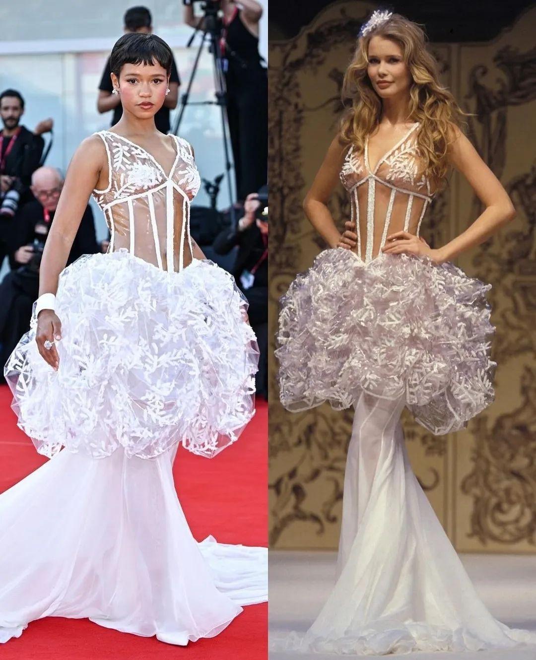 這件禮服此前在秀場由90年代頂級超模克勞迪婭·希佛演繹,效果非常驚豔。