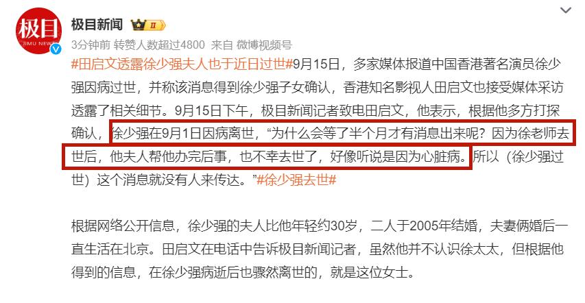 有媒體採訪了香港電影工作者總會原會長、資深電影人田啓文,詢問徐少強在9月1日因病離世,爲什麼時隔半個月消息纔出來?