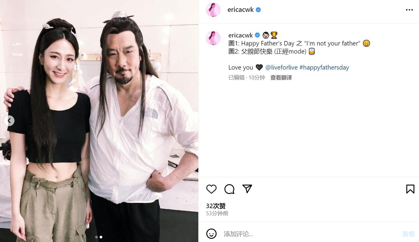 去年的父親節,徐頴堃還曬出了與徐少強的合影,慶祝父親節。在此之前,徐頴堃也多次發佈合照慶祝父親節。