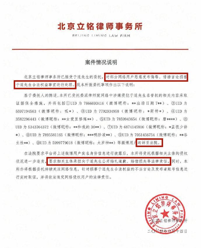 從該聲明可知,該律所受於適委託,對部分網絡用戶惡意發佈侮辱、誹謗言論損害於適合法權益事宜進行處理。