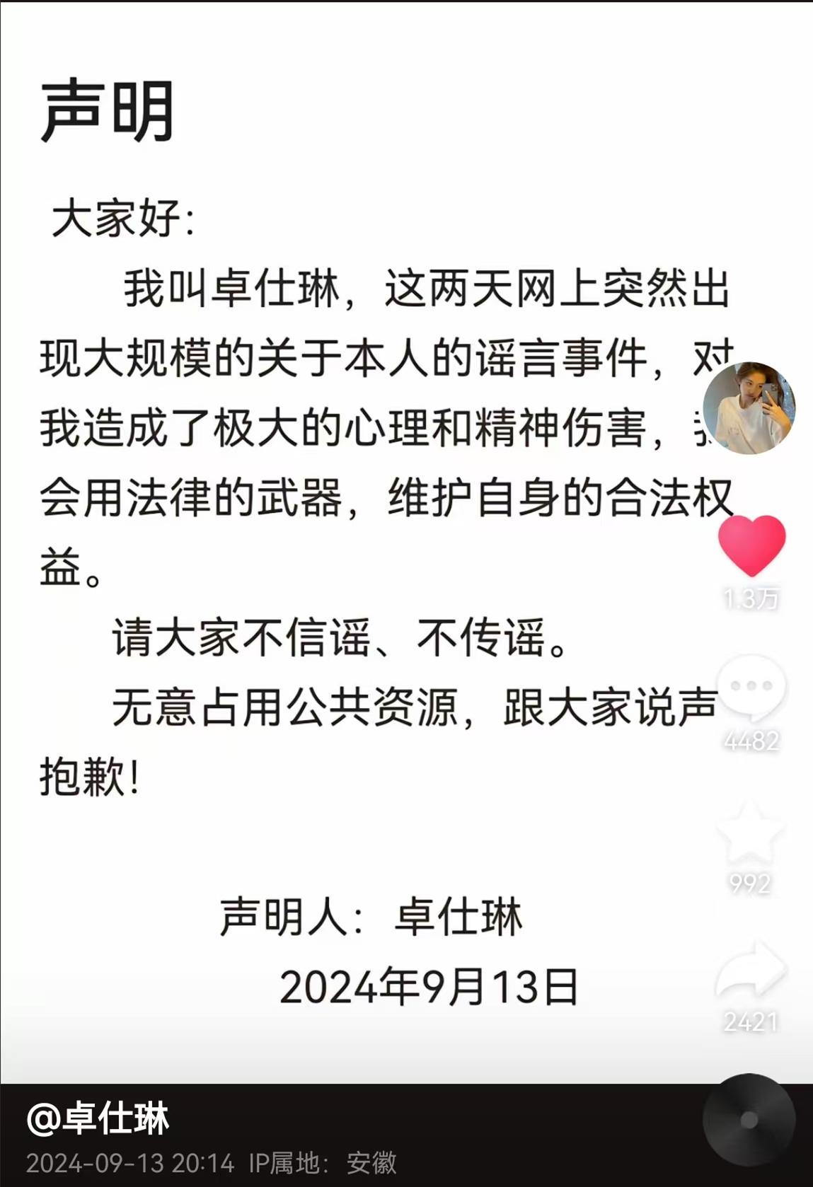 9月13日晚8點多,面對網傳傳言,卓仕琳發佈了聲明。