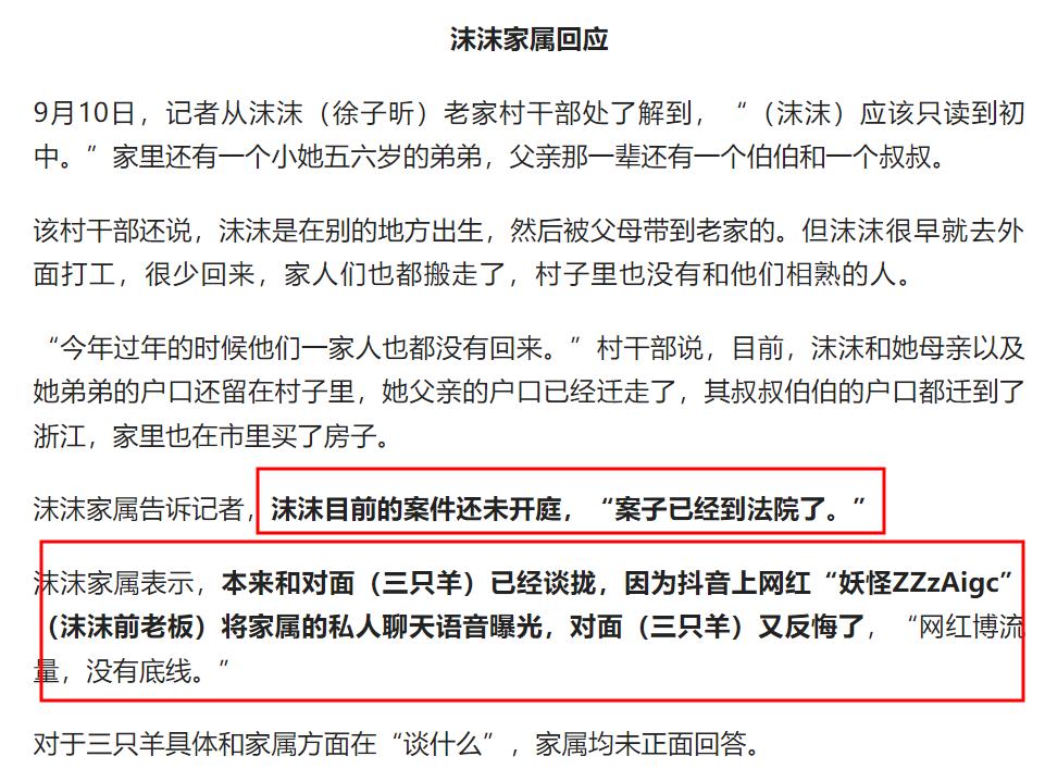 沫沫的家屬還表達了對沫沫前老闆朱旭棟的憤怒,直言原本和三隻羊已經談攏了,但因爲沫沫前老闆將家屬的私人聊天語音曝光,三隻羊又反悔了。