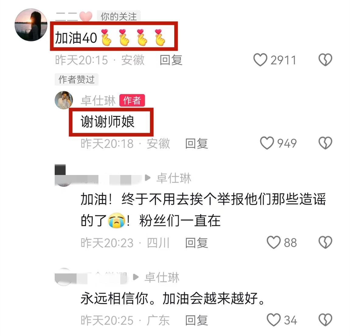 在卓仕琳闢謠聲明的評論區,小楊哥老婆還留言“加油40”,卓仕琳回覆“謝謝師孃”。