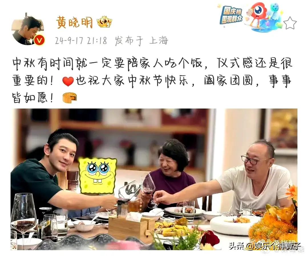 中秋節當天,黃曉明發文祝大家節日快樂,並曬出全家福,帶着兒子小海綿一起回家過節,家人團聚,舉杯暢飲,看到孫子,爺爺奶奶滿臉笑容,難掩內心的喜悅。