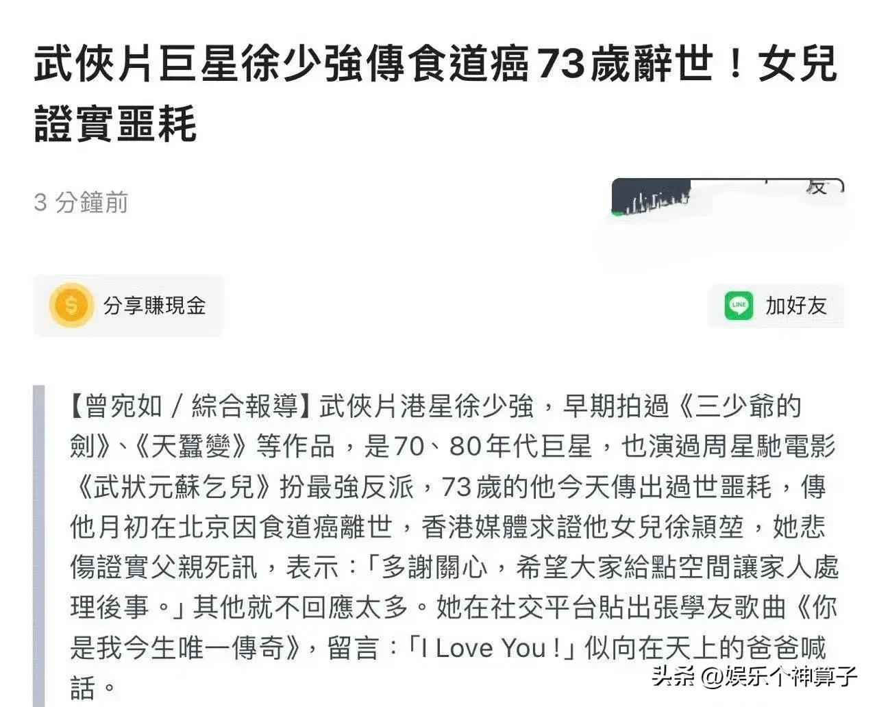 9月15日,娛樂圈傳來噩耗,據香港媒體報道,功夫明星徐少強因食道癌於月初在北京離世,享年73歲,此外,資深電影人田啓文接受採訪時證實此消息!