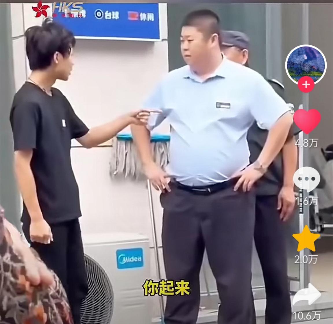 面對這種情況,一般人爲了避免事情鬧大,就不鬧事了。但這位小夥不是,他對物業工作人員說“讓他過來吧”,隨即他用手指着物業工作人員,讓他不要擋路。