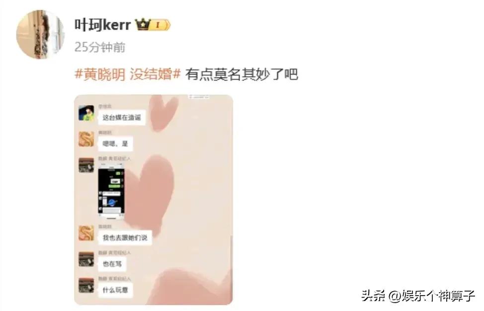 至於劉大錘提到兩人已經領證,此前,葉柯除了發文否認結婚,還曬出黃曉明與工作人員的聊天記錄進行闢謠,這……,感覺當事人都回應過了,感覺八卦媒體的爆料不靠譜。