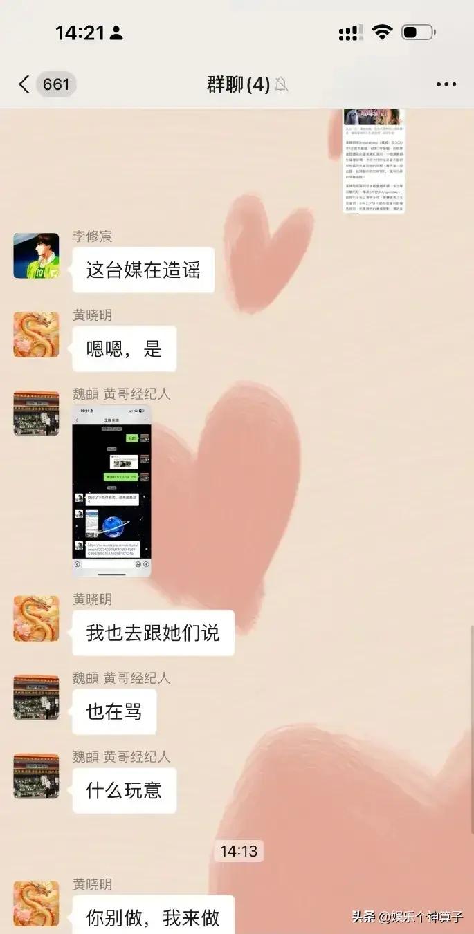 隨後,又曬出黃曉明與團隊的聊天截圖,顯示網上在造謠,經紀人非常生氣,曉明哥正在忙着處理此事,間接否認結婚傳聞。