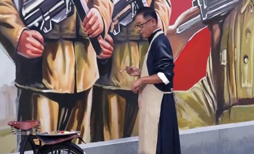 在貼着紅色宣傳畫的街道上,人民軍隊不斷路過,他則是慢條斯理地上色。