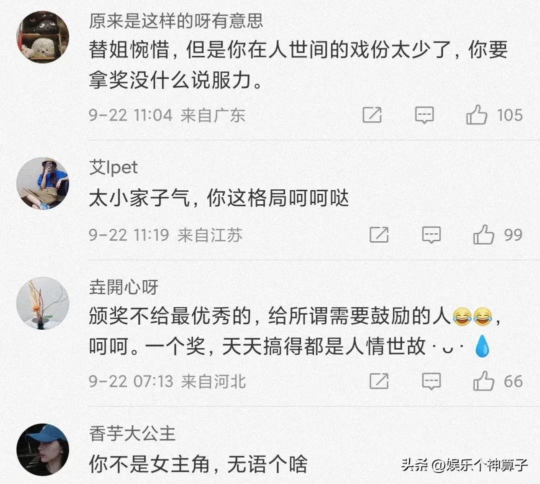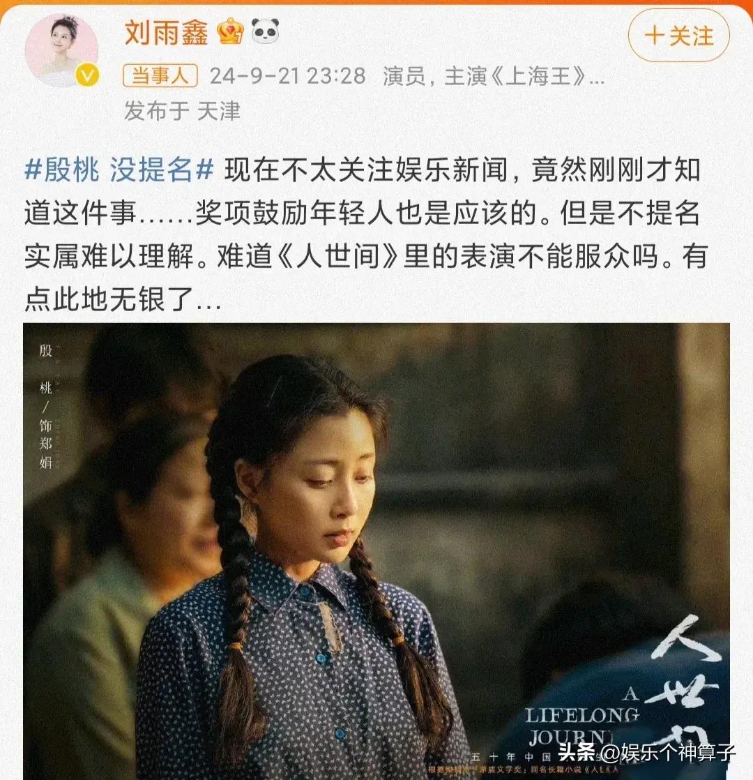 萬萬沒想到,演員劉雨鑫看不下去了,發文力挺殷桃,認爲其在劇中的表現非常精彩,不提名難以理解,按理說,爲好演員感到惋惜,本無可厚非,然而,偏偏提到:“獎項鼓勵年輕人也是應該的”!還瞬間登上熱搜。
