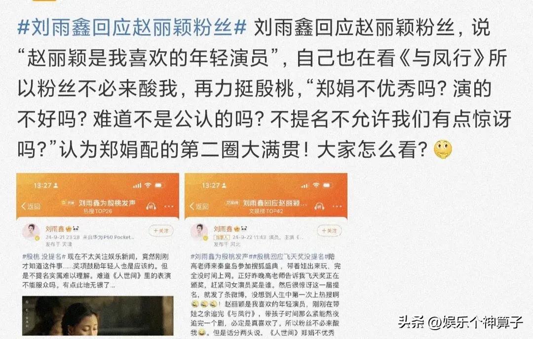 劉雨鑫又特意發文回應,表示趙麗穎是自己非常喜歡的年輕演員,希望穎寶的粉絲不要再來酸,並再次力挺殷桃,覺得鄭娟這個角色值得第二圈大滿貫。