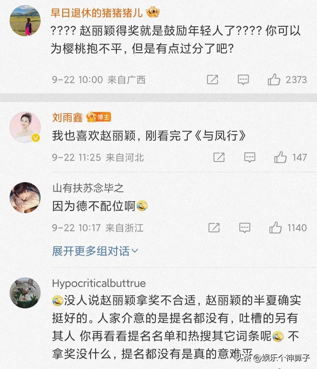關鍵是趙麗穎獲獎了,劉雨鑫又認爲殷桃值得大滿貫,結合前一條博文,這……,確實很容易讓人誤會,當然,可能本意並非如此。